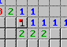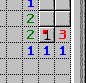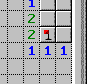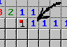 Jetzt ist klar: Das Feld rechts neben der markierten Mine kann keine Mine sein, wegen der rechten und der mittleren Eins! In direkter Umgebung dieser Einsen gibt es nur eine Mine, und die ist ja schon "entdeckt". Also kann man dieses Feld mit der linken Maustaste aufdecken.